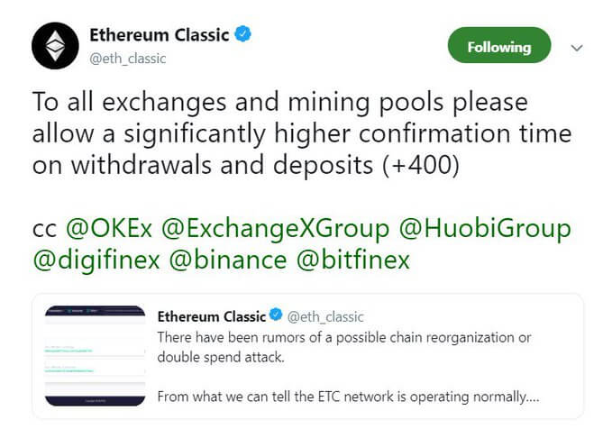 There is no doubt that the chain reorganization did happen, probably after the tweet. The next tweet by Ethereum Classic only fueled more rumors. In the tweet, exchanges and mining pools were informed about the need to increase transaction confirmation time and set a minimum limit for coin deposits and withdrawals.