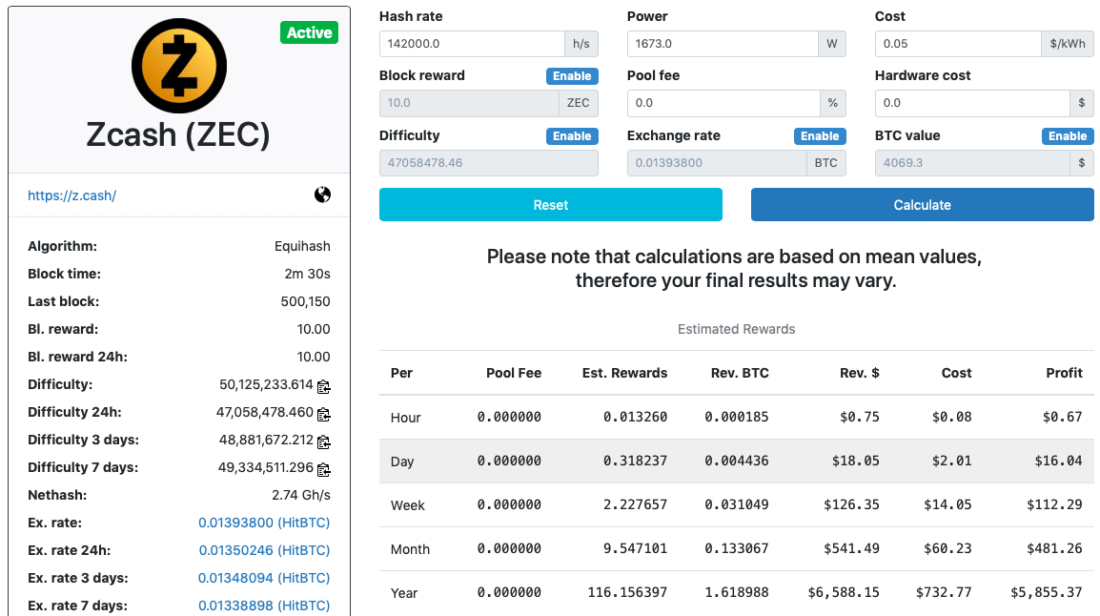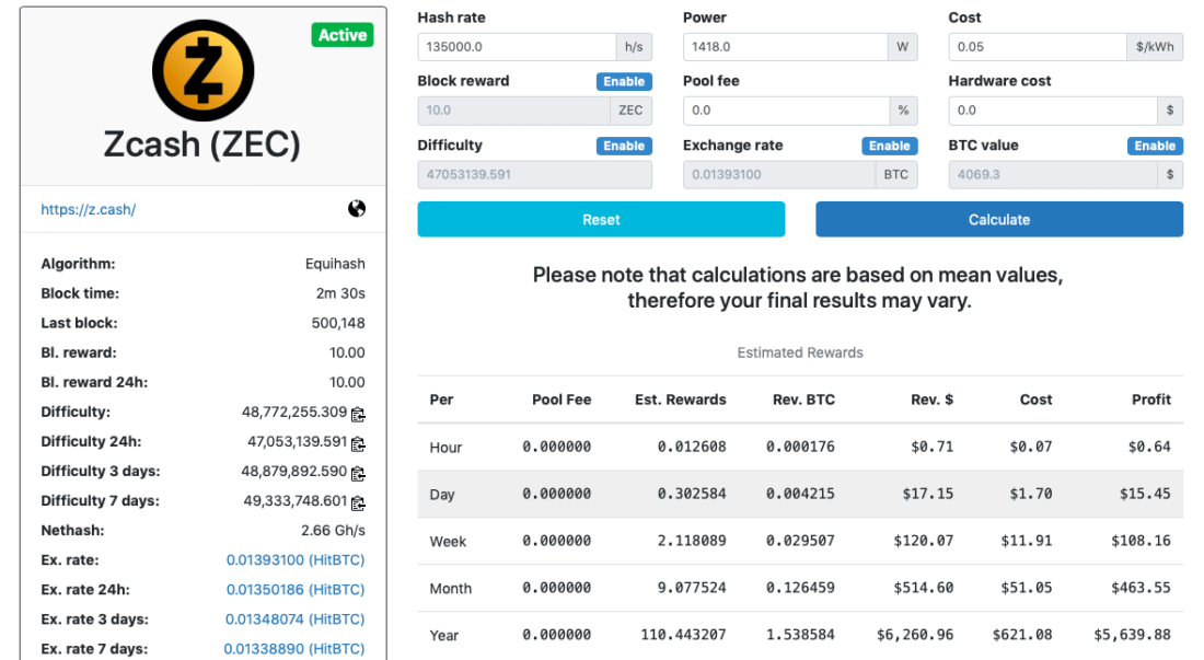 Let’s go to WhatToMine. The miner is aimed for mining Zcash, so we’ll choose this coin and indicate hashrate and energy consumption. We will be testing it in two modes: energy-saving and high-performance. We are setting the cost of 1 kWh at $0.046.