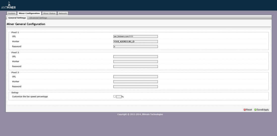 URL: zec.2miners.com:1111 Worker: YOUR_ADDRESS.RIG_ID Password: x