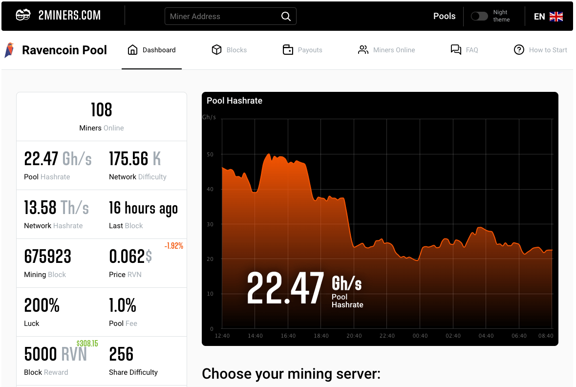 We are glad to finally have the Ravencoin (RVN) mining pools at 2Miners. RVN is one of the most popular coins for GPU mining this year. The coin ranks 43rd in the coinmarketcap’s top-100. Requirements for mining are quite low so RVN could be basically mined with any GPU. The mining algorithm is X16R.