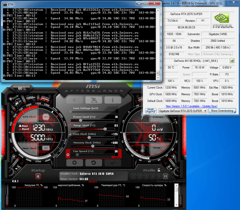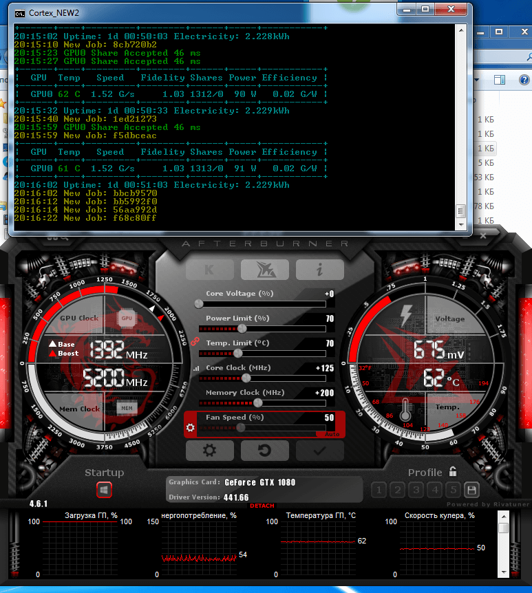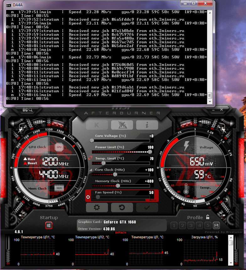 As you can see in the screenshot if you lower the 1660 core voltage to 650 mV, the hash rate drops significantly, but energy efficiency doesn’t grow. It’s important to search for and know your GPU’s optimal minimum, as well as an optimal maximum (without overheating). Overheating leads to a significant deterioration of GPU functions and can even cause it to break.
