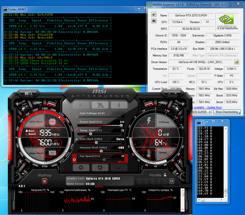 For example, if such users set the power limit at 240W in RaveOS for the 2070s GPUs, they wouldn’t understand that on this algorithm a GPU doesn’t consume more than 200W, as the short active core load stage is followed by the long memory load stage.