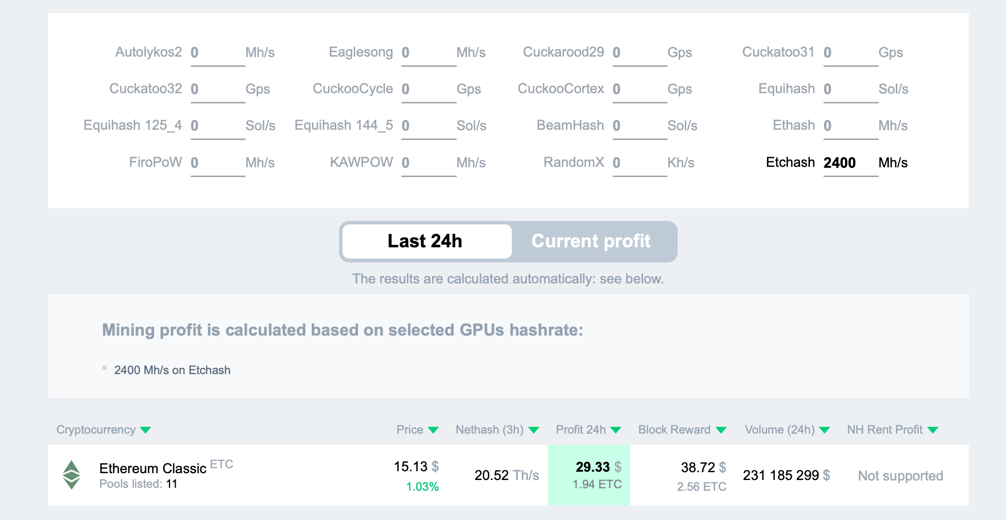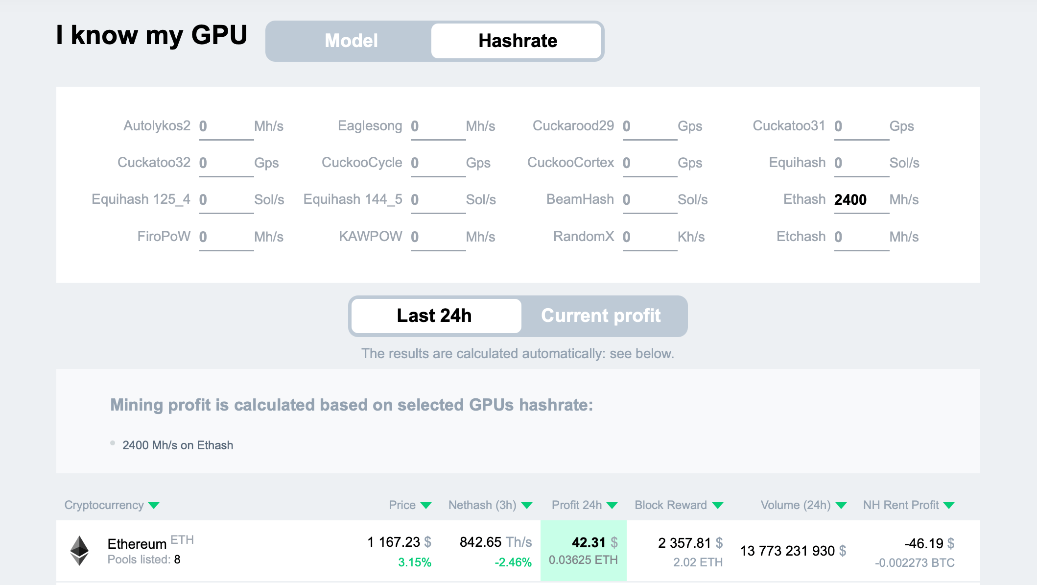 How profitable is the miner with such a hash rate? According to 2CryptoCalc, ETH is the most profitable coin for mining. At the current exchange rate and network difficulty, you can expect to get an equivalent of almost $42.