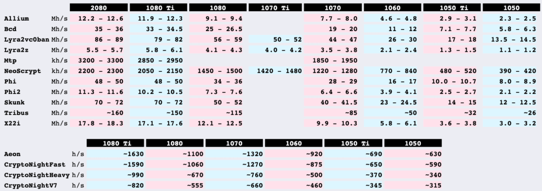 Nvidia GTX 1080 Ti – 2,850–2,950 kh/s;
