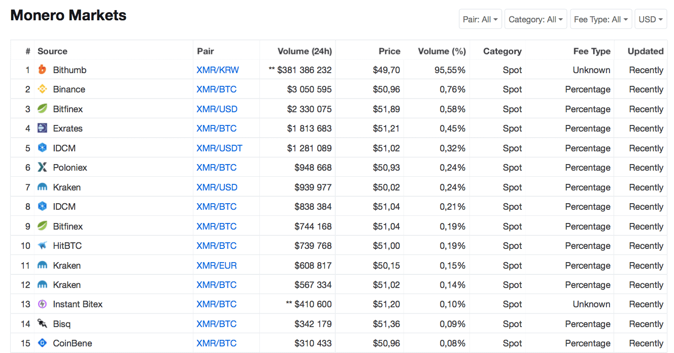 Bithumb accounts for over 95% of XMR transactions. Other exchanges that sell XMR are Binance, Bitfinex, Poloniex, Kraken, HitBTC, CoinBene, etc.