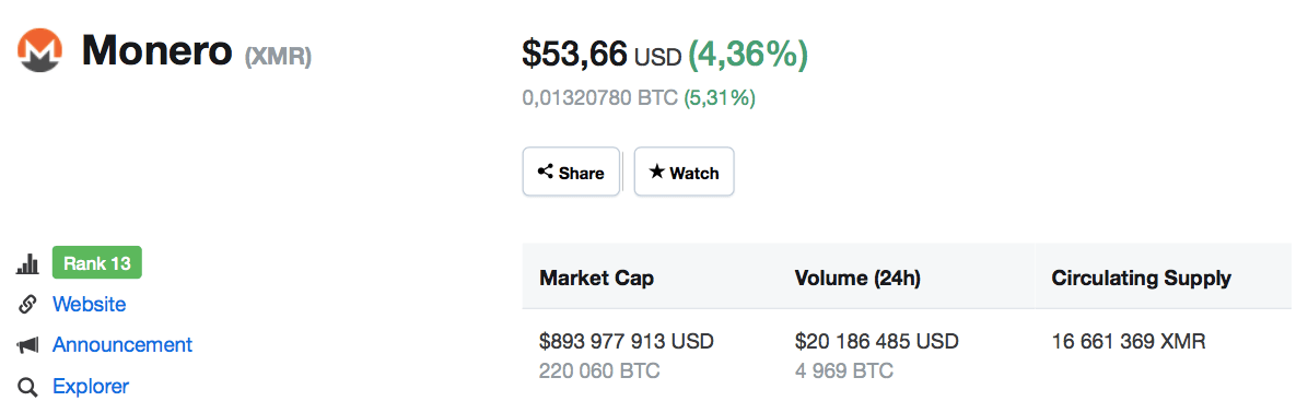 Monero is 13th in the world cryptocurrency ranking. Today it costs $53; market capitalization is almost $894 million.