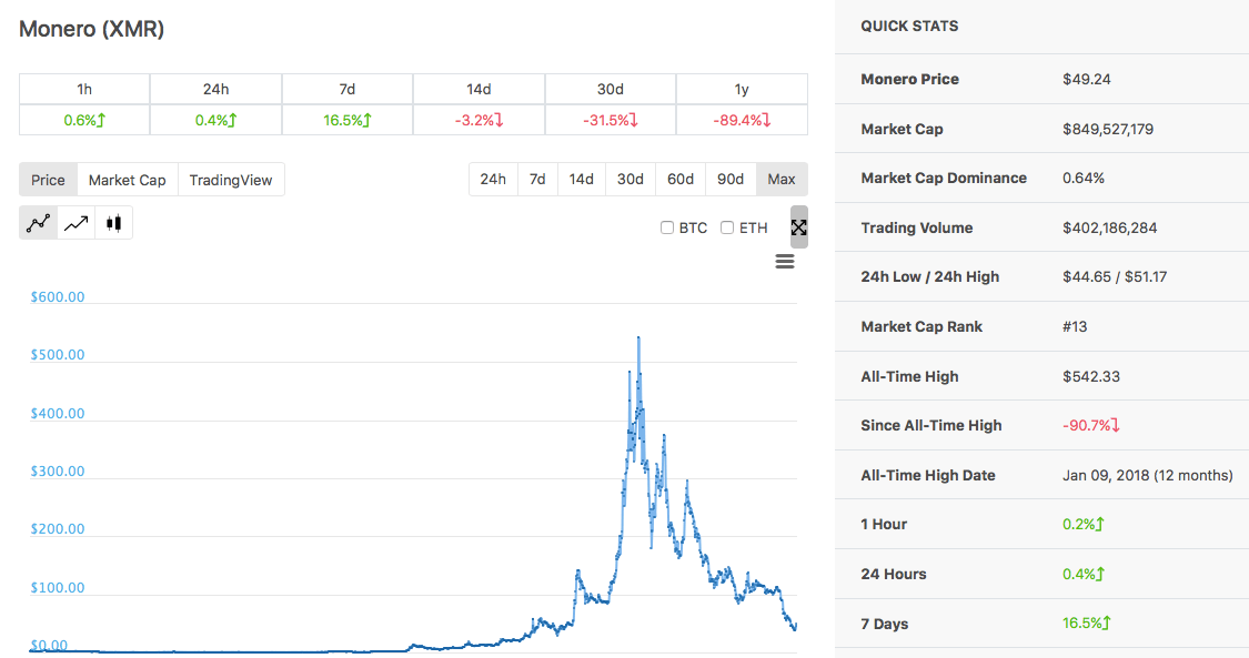 The rate chart is similar to Bitcoin. XMR’s price reached its peak on January 9, 2018, and amounted to $542. Good times.