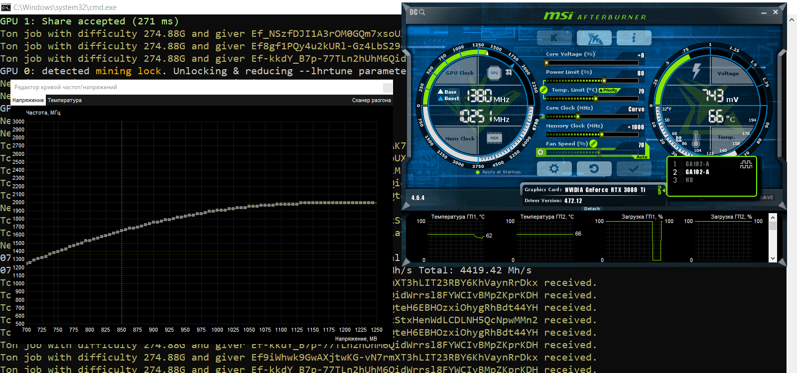 Configuration 2. Fix the clock and voltage. We used the Voltage/Frequency Curve Editor in MSI Afterburner. We launched the mining program on the rig with the following GPU settings: PL(%): 80, CC (MHz): 0 fix Voltage(mV) 725, MC (MHz): +1000.