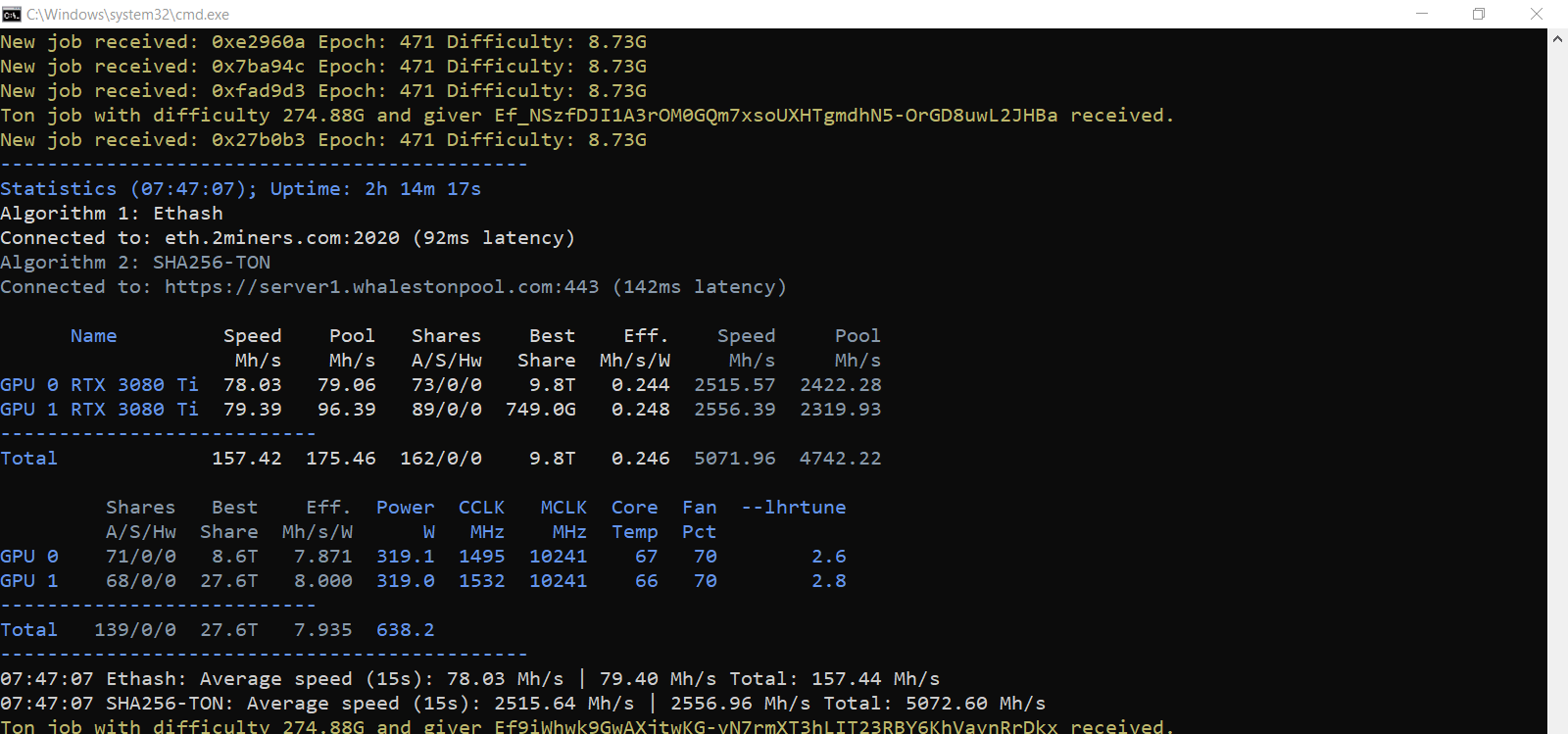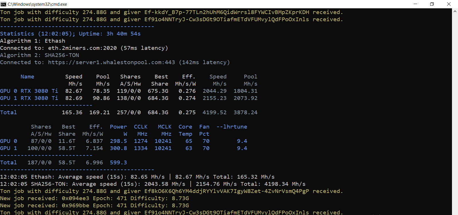 lolMiner.exe --algo ETHASH --pool eth.2miners.com:2020 --user WALLET_ADDRESS1.RIG_ID --dualmode TONDUAL --dualpool https://server1.whalestonpool.com --dualuser WALLET_ADDRESS2 --tstop 70 --tstart 50 --timeprint on --longstats 30