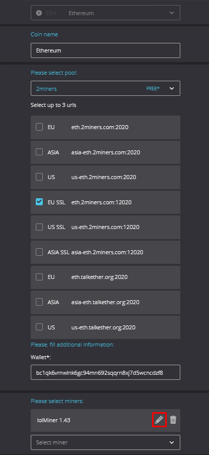 Create a regular wallet address for ETH and choose the latest lolMiner’s version. Add the following to the miner configuration.