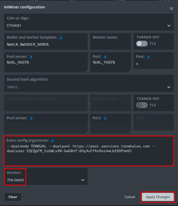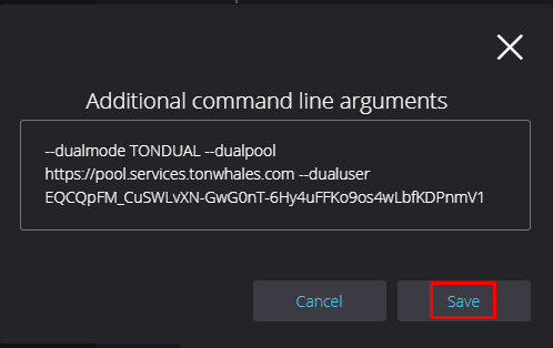 --dualmode TONDUAL --dualpool https://pool.services.tonwhales.com --dualuser TON_WALLET_ADDRESS