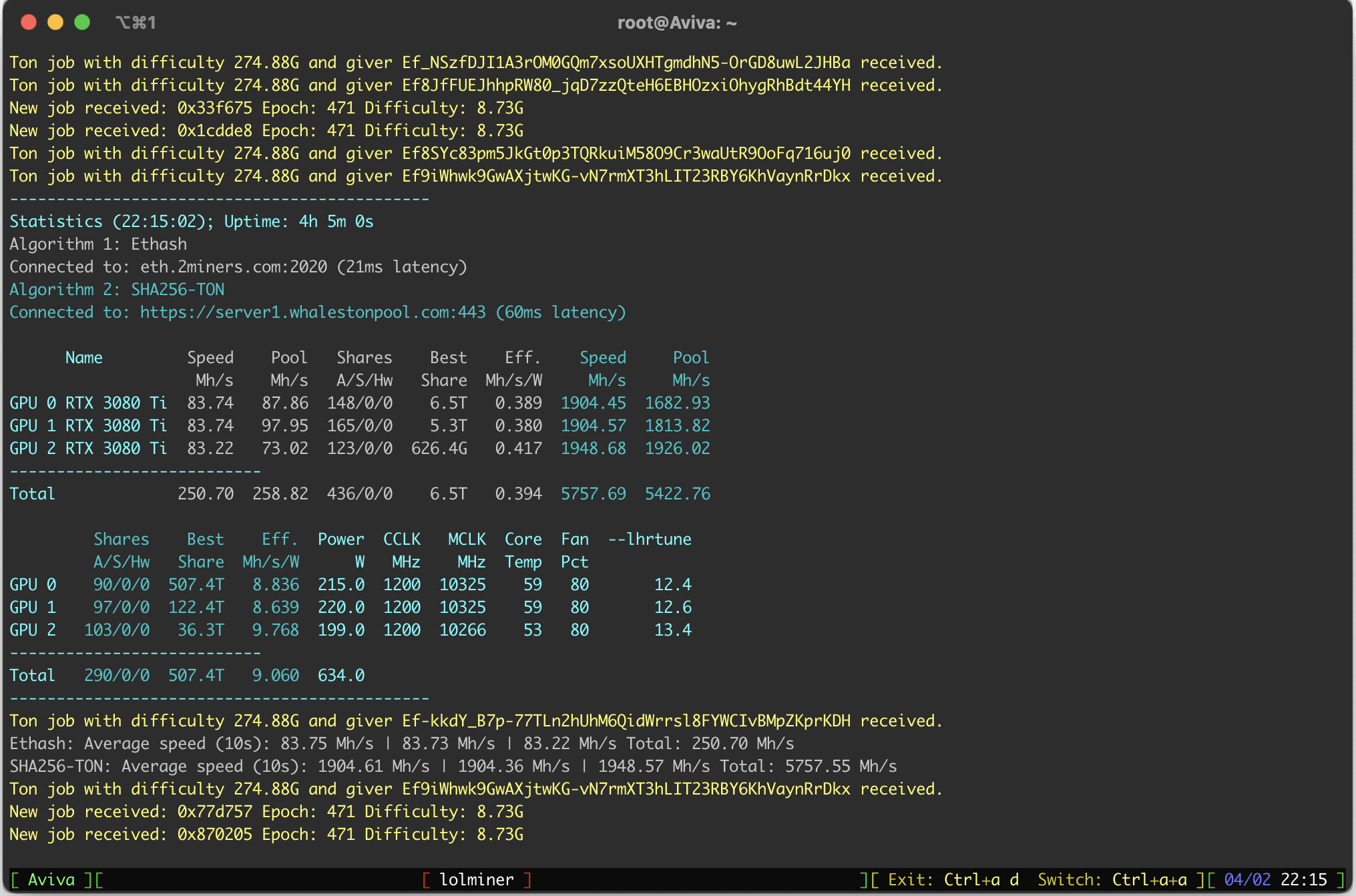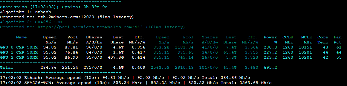 When dual mined this way, the Ethash algorithm showed a hash rate of 78–79 Mh/s, which was 6 Mh/s less compared to the Ethash’s hash rate when mined alone. The SHA256 algorithm showed a hash rate of 2515–2556 Mh/s. The SHA256’s hash rate depends on the core clock and PL. When the CC value is high during mining, the balance shifts to TON.
