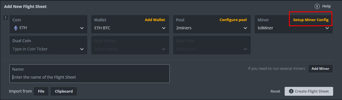 Use a regular wallet that you use for ETH mining. Create a flight sheet, as shown in the screenshot below, choose lolMiner, then click on the Setup Miner Config.