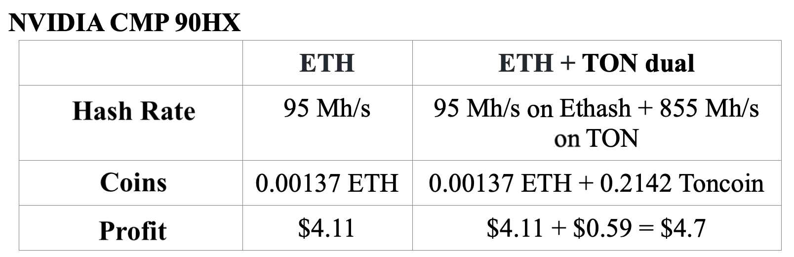 Ethereum + TON dual mining on Nvidia CMP 90HX is more profitable by $0.59.