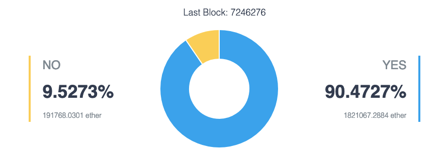 In the same time Core Devs also evaluating signals from coin holders at progpowcarbonvote.com. At the moment 2 012 835 Ether (~2% of total ETH supply) stated their opinion on ProgPoW, with 1 821 067 Ether voting Yes.