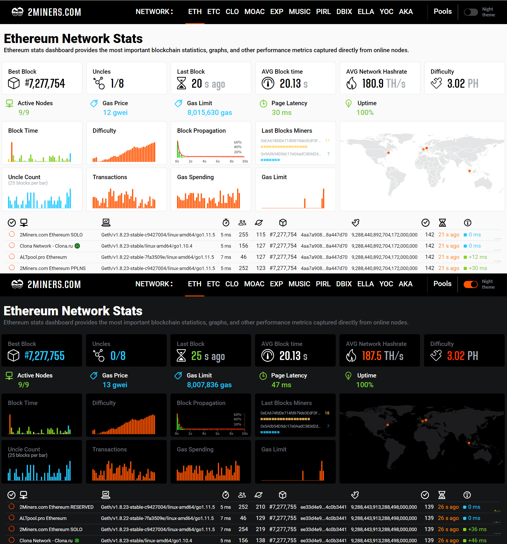Network statistics page will show up. It is available in both Day/Night modes just like the dashboards. The netstats is available now for coins: ETH, ETC, CLO, MOAC, EXP, MUSIC, PIRL, DBIX, ELLA, YOC, AKA. More coins to come soon.