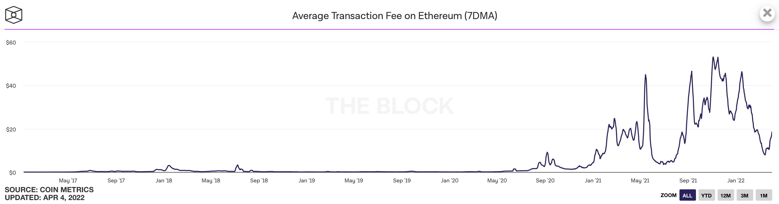 As a result, the blockchain has been constantly overloaded. Below you can see Ethereum’s average fee chart. The peak value of $52 was registered on November 3, 2021.