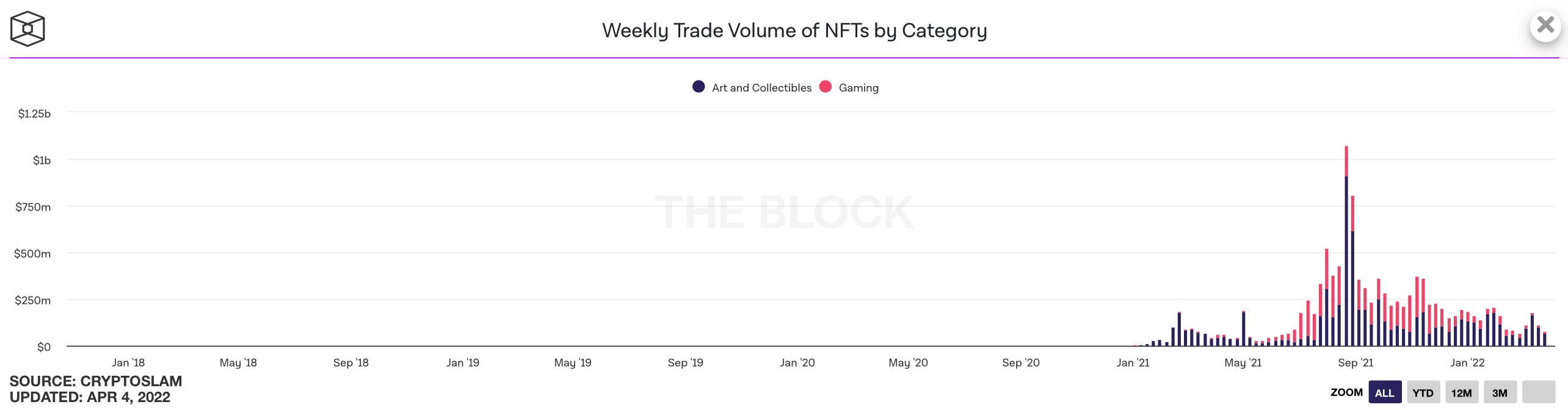 NFTs have been gaining more and more in popularity. Here is an NFT trading chart since January 2018. Notice the 2021 leap.