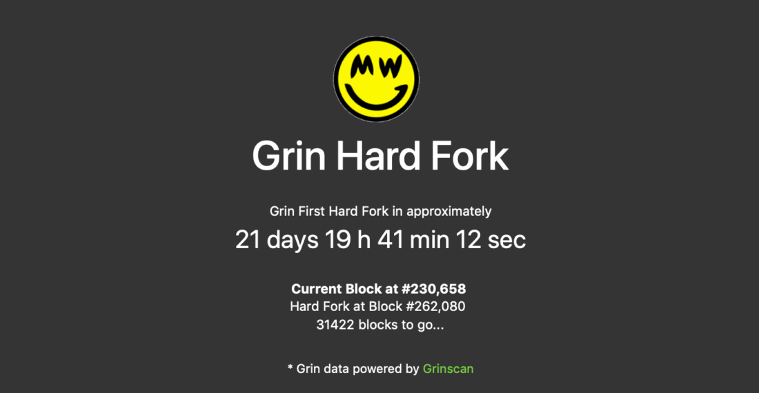 The testnet of the new network version was launched on June 23 at block 185,040. Grin hardfork will take place at block 262,080. Expect it to occur on July 17, 2019 at 09:28:28 (UTC+3). The live countdown is held on this page.