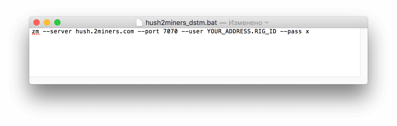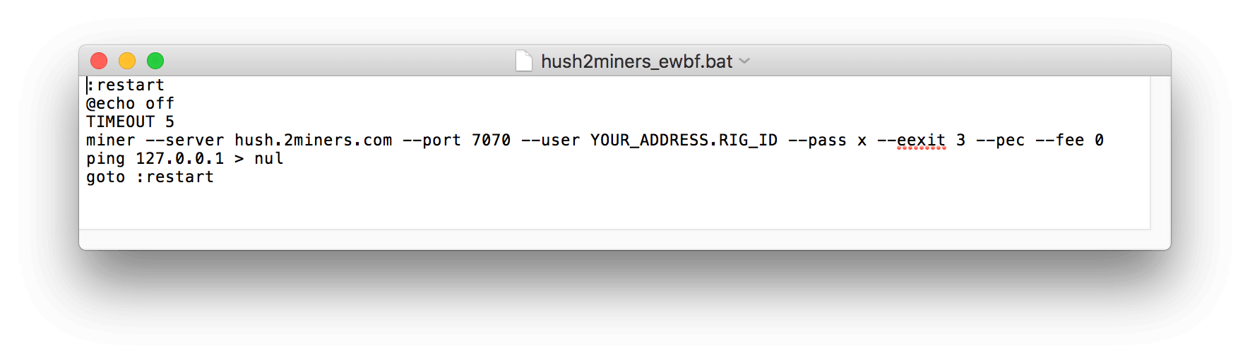 - Open bat file using Notepad. Insert Hush wallet address and your rig name (8 symbols max; only Latin letters, numbers 0-9, underscore and hyphen). Save and launch the file.