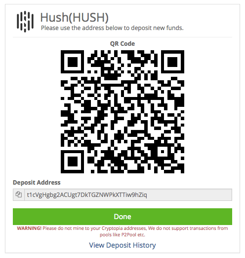 To get coins, you need a Hush wallet address. There are two ways to get it – you can either download the wallet software for your OS from the official website or create a wallet on some exchange. For the moment, Hush is traded exclusively on Cryptopia exchange. After registration, you need to go to the ‘Deposit’ page and choose Hush from the search results. This process will then create the address that will let you get coins.