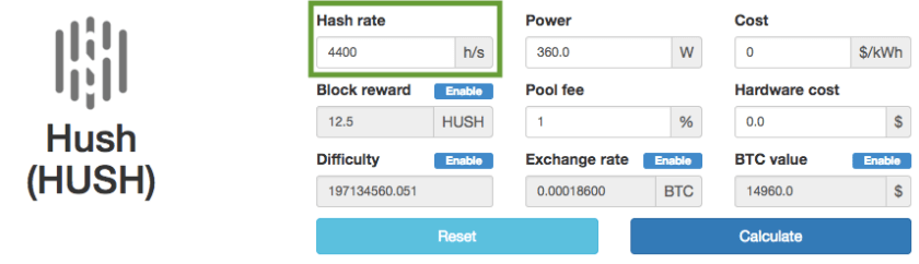 There is an online Hush reward calculator on WhatToMine. You just have to enter your rig hashrate and press ‘Calculate’ — the website will then calculate your estimated rewards.