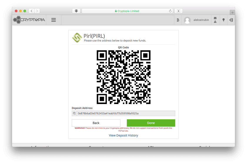 The easiest way is to create a wallet on the Cryptopia exchange. After registration go to the ‘Deposit’ page, search for Pirl, and get your address. Don’t worry if you see the warning against using your Cryptopia address for mining; you’ll get coins without problems regardless.