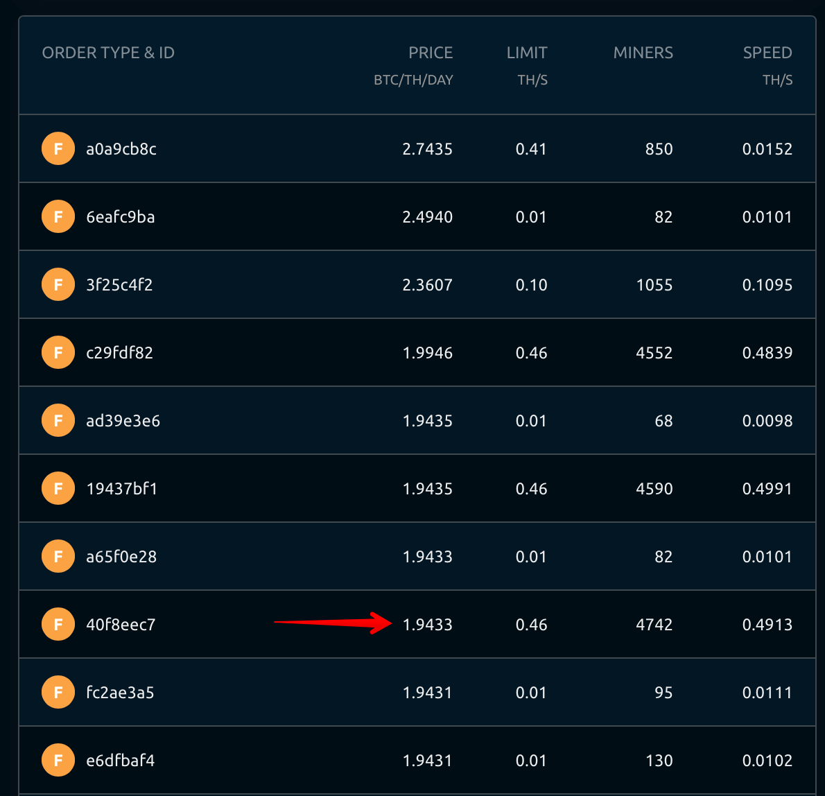 Here’s someone renting almost 0.5 TH/s for 1.9433 BTC/Th/Day, which is less than 2.0344 BTC/Th/Day. Let’s consider these numbers with the price.
