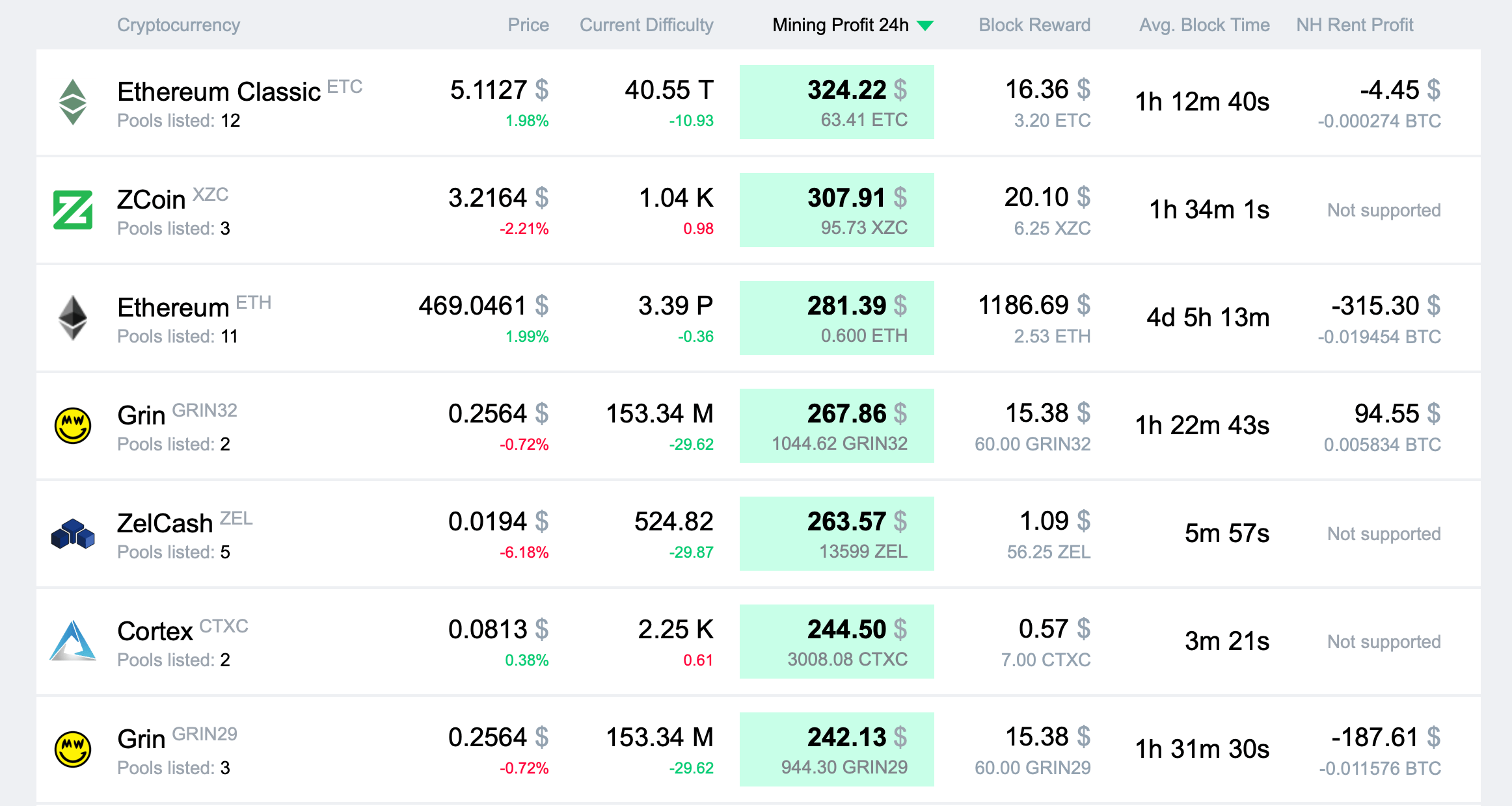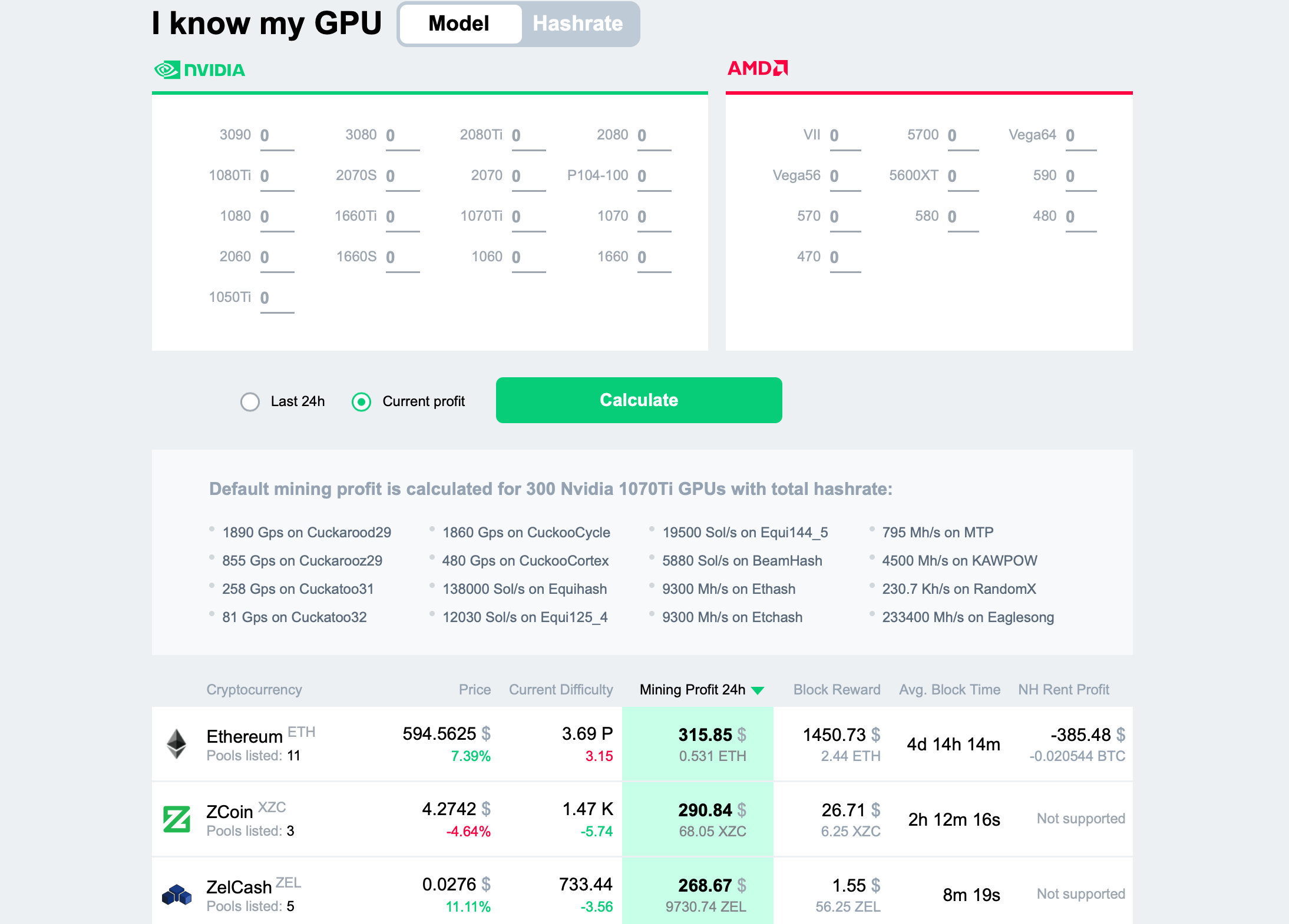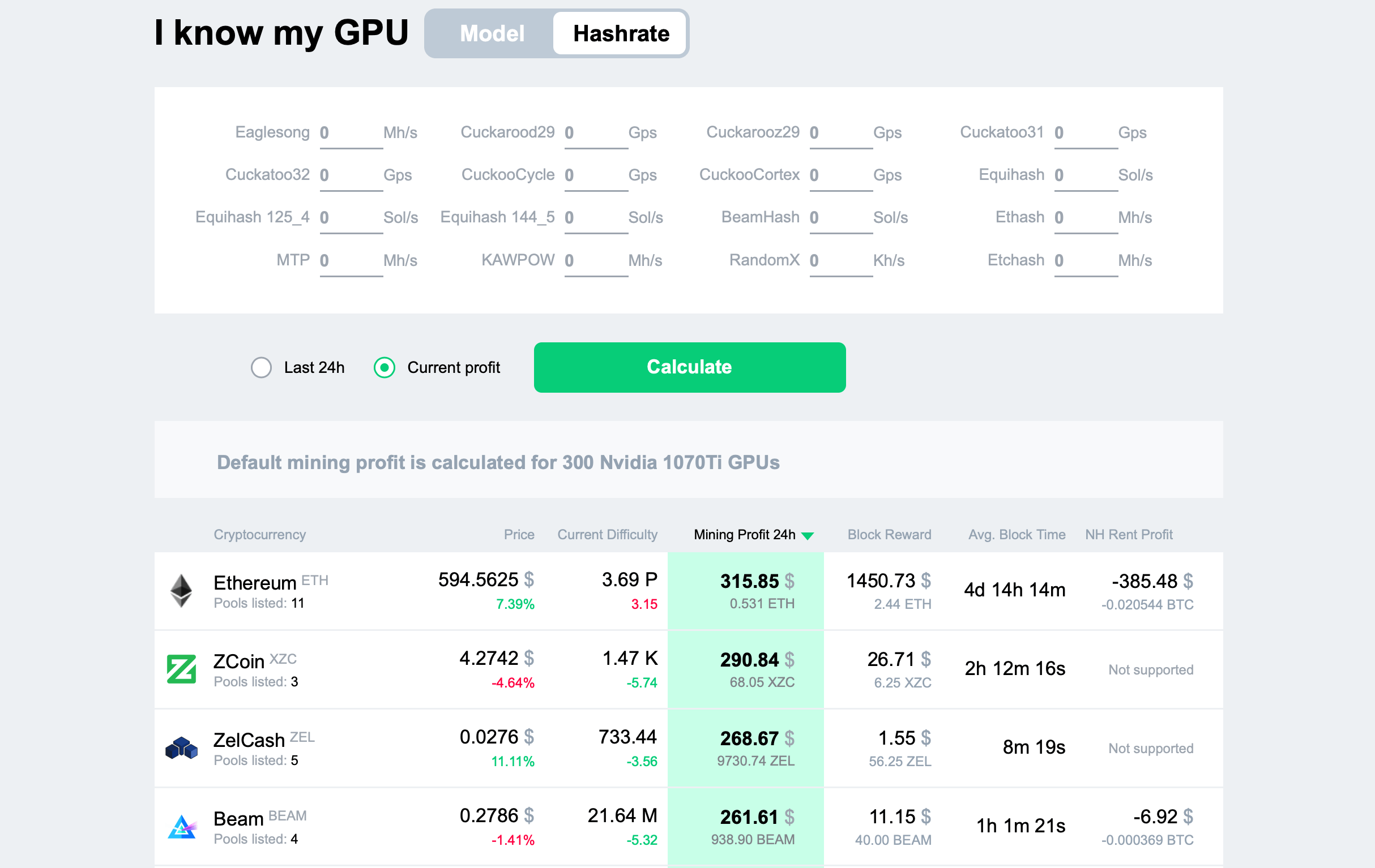 If you don’t enter the number of GPUs, then by default, the 2CryptoCalc main page shows you mining profitability for 300 Nvidia 1070Ti graphics cards. It may be useful if you like to always stay up to date and see the big picture. For example, you may want to know how profitable mining is overall, or which cryptocurrency is leading today.