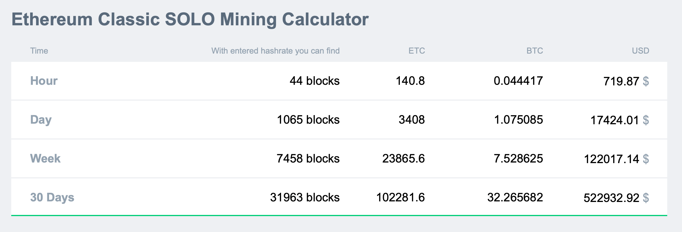 Let’s calculate ETC mining for 0.5 TH/s using 2CryptoCalc. Let’s go there, enter 500000, and scroll to the SOLO section.