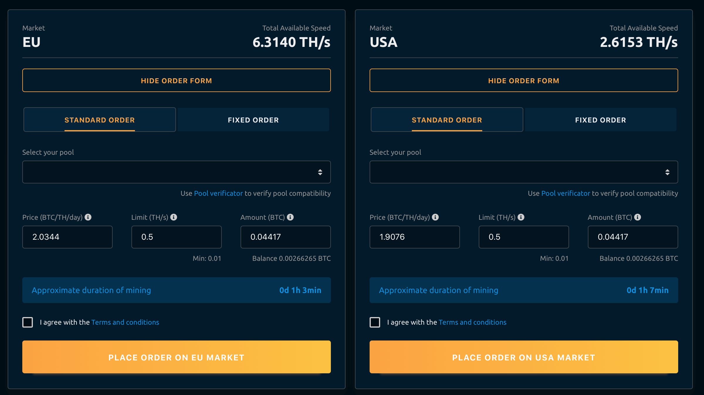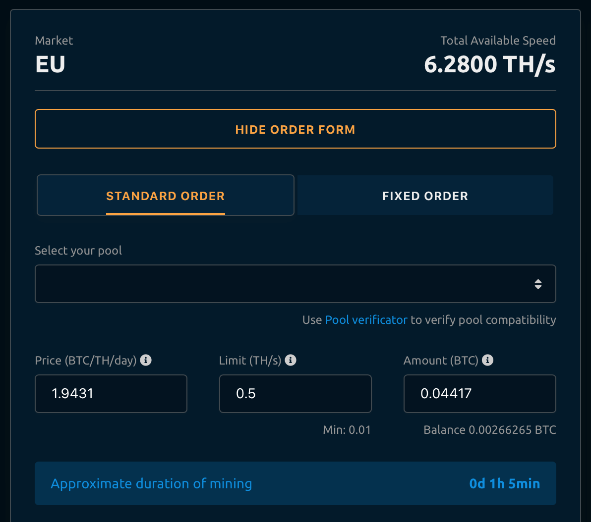 Let’s go to Nicehash, choose the algorithm to mine ETC, and enter our values – 0.5 TH/s and 0.044417 BTC. So we can mine for 1 hour and 3 minutes. This is the result you get if the price is 2.0344 BTC/Th/Day. But as we said before, it’s not the optimal price. Let’s see how much others quote for power.