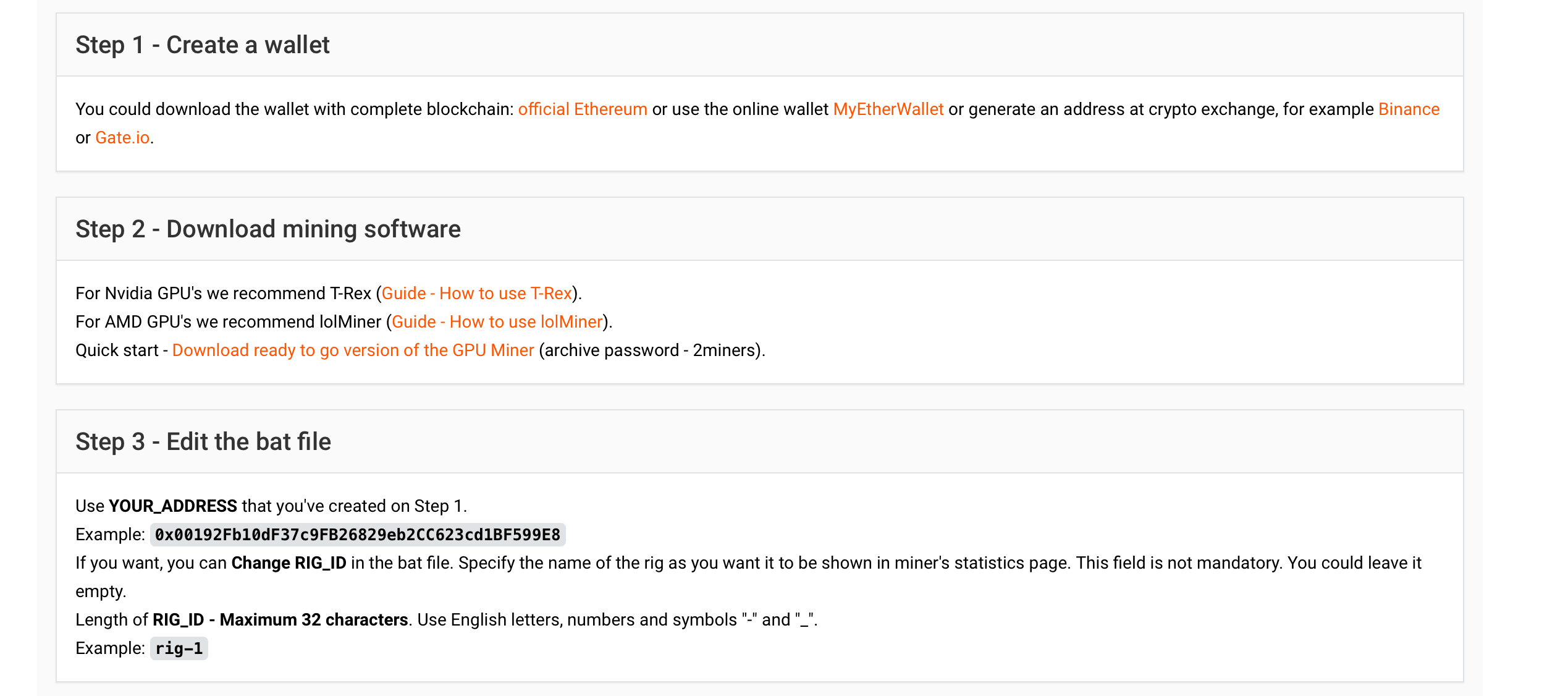 If you are satisfied with the result and interested in mining, the next step is to find the most profitable coin for your graphics card. To find it, go to the 2Miners pool. Each pool’s How to Start Mining page tells you which software you need to download and how to get a cryptocurrency wallet. It also has a video tutorial on mining setup that’s only 2–3 minutes long. It will take you the same amount of time to actually set up your equipment. Here is what the How to Start Mining page of the Ethereum pool looks like.