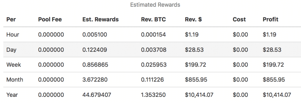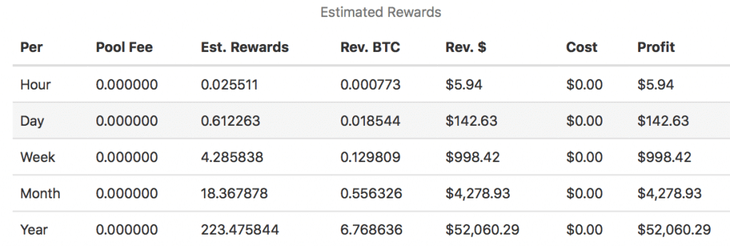 At the current level of mining difficulty and exchange rate, Zcash miner will bring $142 a day, or $4,278 a month.