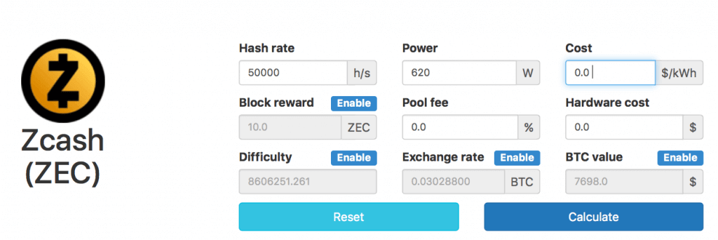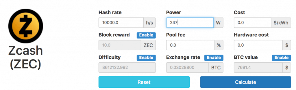 Now let’s calculate the profitability of the Bitmain’s ASIC miner. Its hashrate is 10,000 h/s, and the power is 247 W. We are using Zcash again as an example.