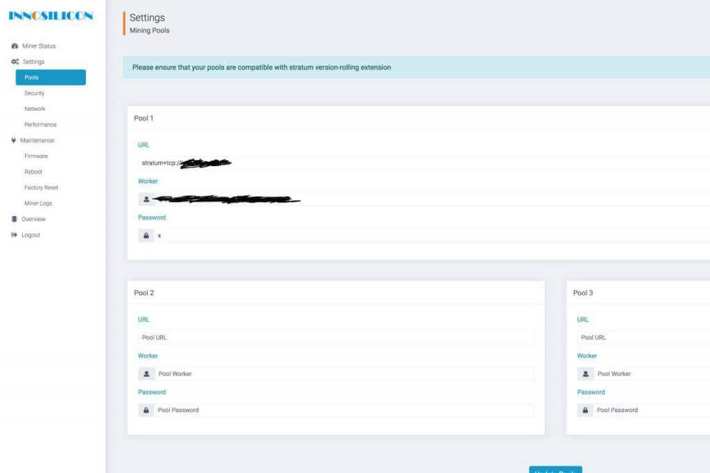 Let’s go to the ASIC miner settings. The main menu is in the column on the left.