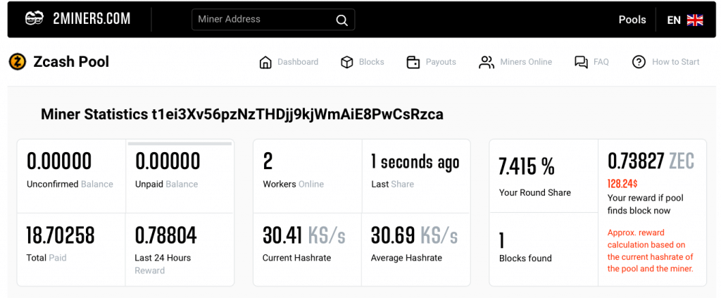 After you finish the setup, let’s check if everything works correctly. Go to the 2Miners main page and enter the wallet in the ‘Miner Address’ field. The field is at the top of the page in the middle.