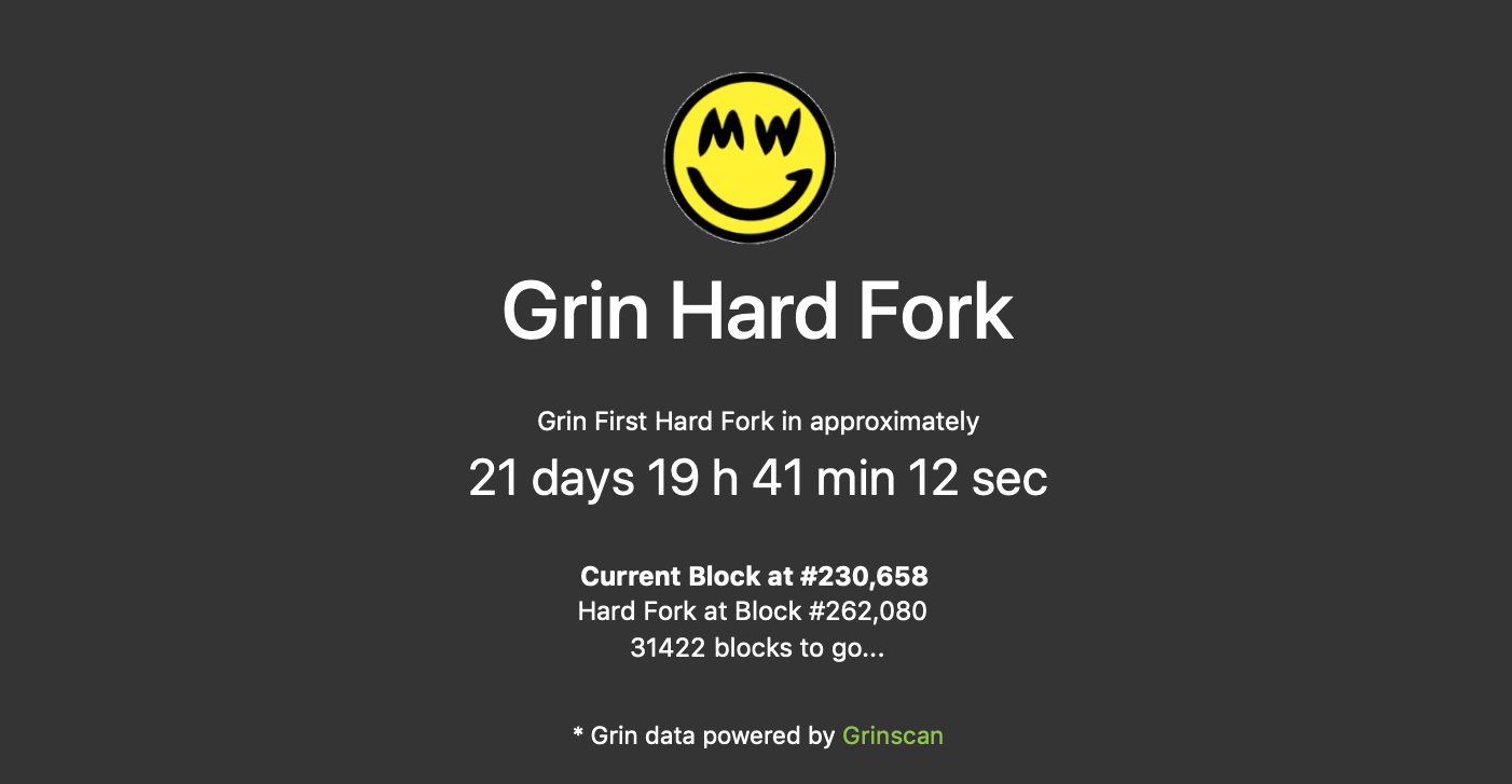 The first hardfork of Grin cryptocurrency is scheduled on block 262,080 (approx. July 17th).