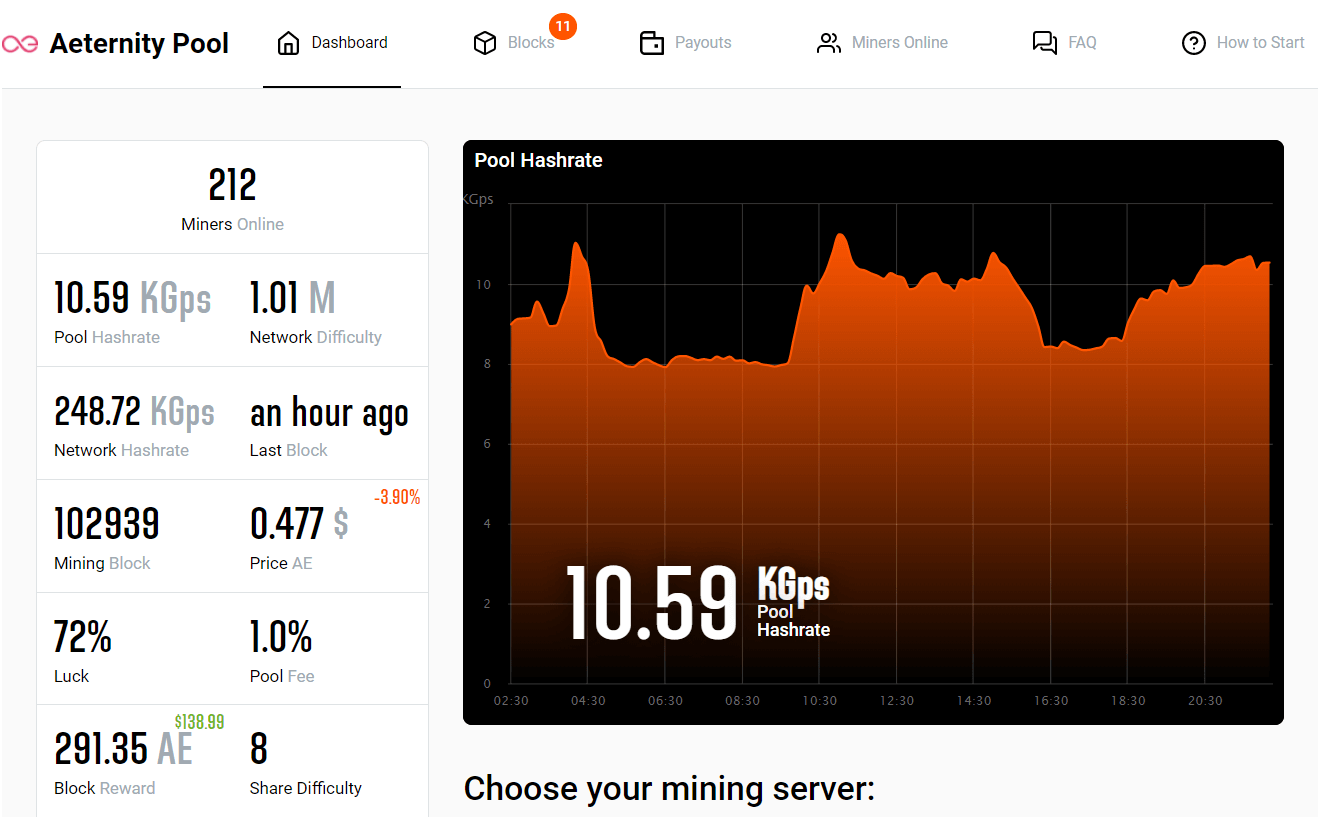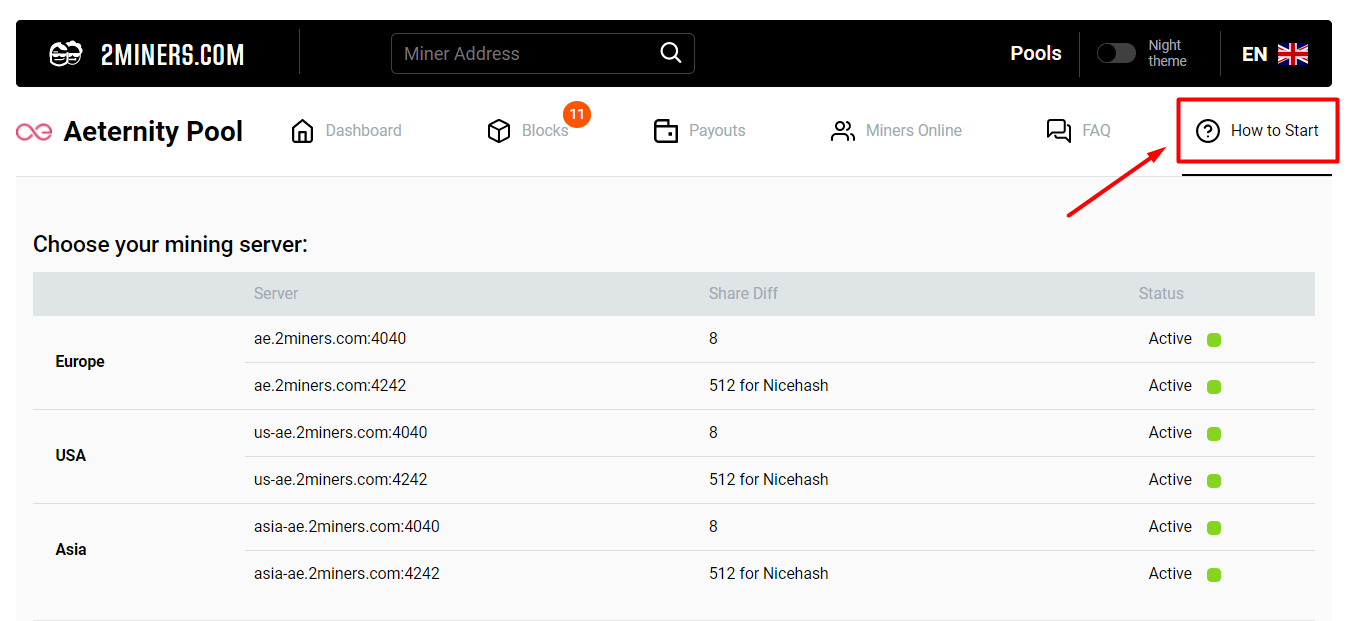 We advise you to select the server which is located closer to you to minimize your ping and share acceptance time (What is share?). You could find the list of the servers on the “How to start” page of every pool. Here is an example for Aeternity Help: