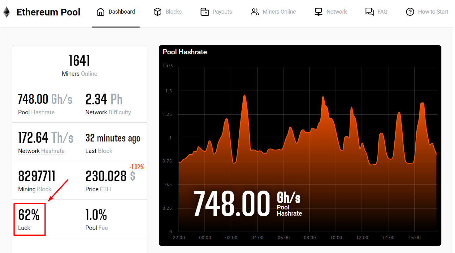 - “Pool finds block when Luck is 100%.” That is not true. Pool finds a block with 100% Luck on average if we take into account many blocks, for example, 1000 blocks. It is not possible to predict the Luck of the next block.