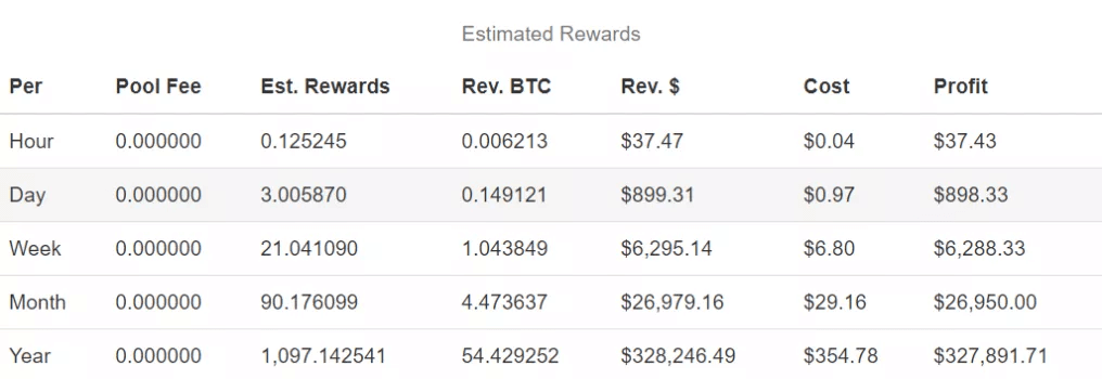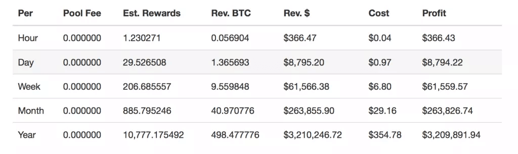 One more time – what does that mean? It means that in a perfect world with such hashing power you would find one block daily (3 ETH coins = $900) Look at the table below, at 17.45 GH/S it shows 3 ETH per day.