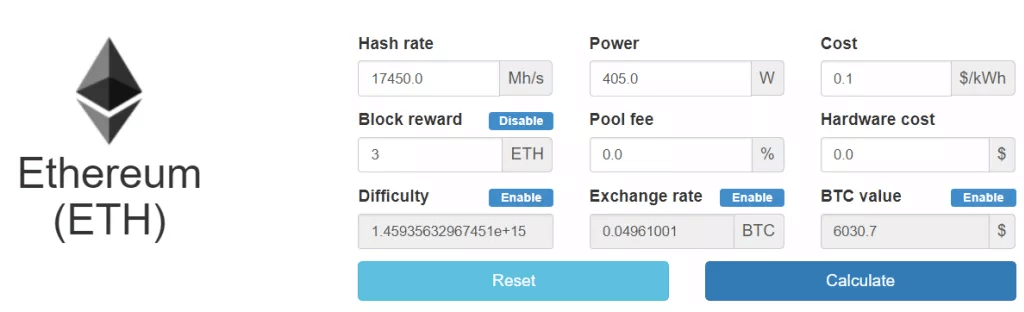 Let’s take Ethereum as an example. We go to Whattomine, choose Ethash algorithm, check out the reward for one block – it’s 3 ETH coins. Then we start to increase the hashrate until we find the value at which the calculator shows 3 coins per day.