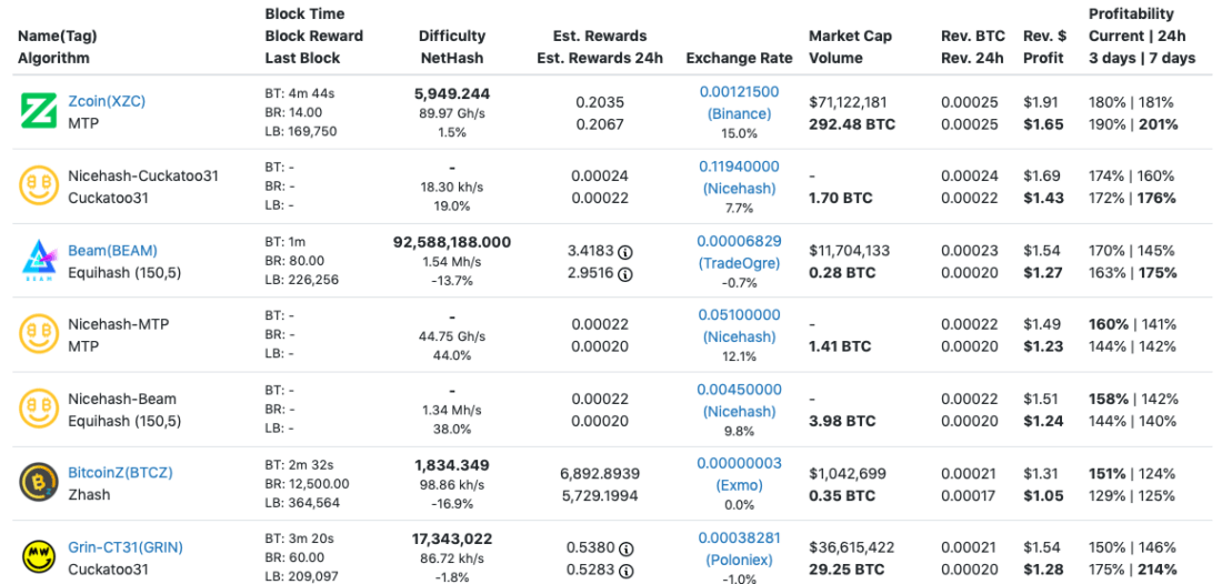 AVG. PRICE – $419 HASH RATE ON ETHASH – 27.6 Mh/s HASH RATE ON ZHASH – 54 h/s CORE CLOCK – 1680 MHz VIDEO MEMORY – 6 GB GDDR6 CONSUMPTION – 160 W WHAT TO MINE – Zcoin, Beam, Grin, Ravencoin, Ethereum, Ethereum Classic MAX. PROFIT IN 24 HOURS – $0.79 on Zcoin