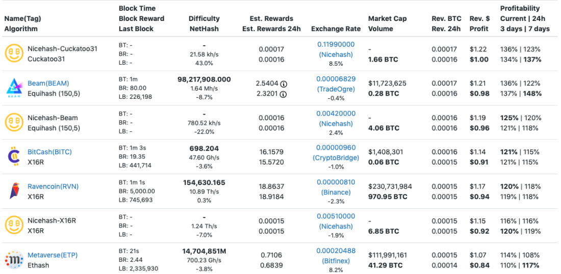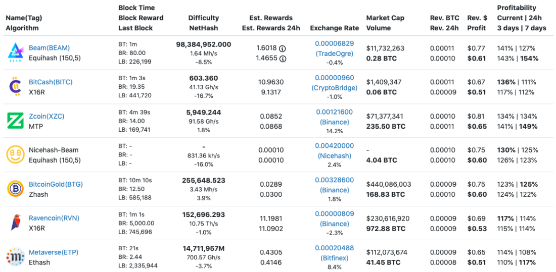 AVG. PRICE – $1,152 HASH RATE ON ETHASH – 49.5 Mh/s HASH RATE ON ZHASH – 86 h/s CORE CLOCK – 1582 MHz VIDEO MEMORY – 11 GB GDDR5X CONSUMPTION – 250 W WHAT TO MINE – Zcoin, Beam, ZelCash, Ethereum, GRIN, Ravencoin, Ethereum Classic, Metaverse, Expanse MAX. PROFIT IN 24 HOURS – $0.98 on Beam